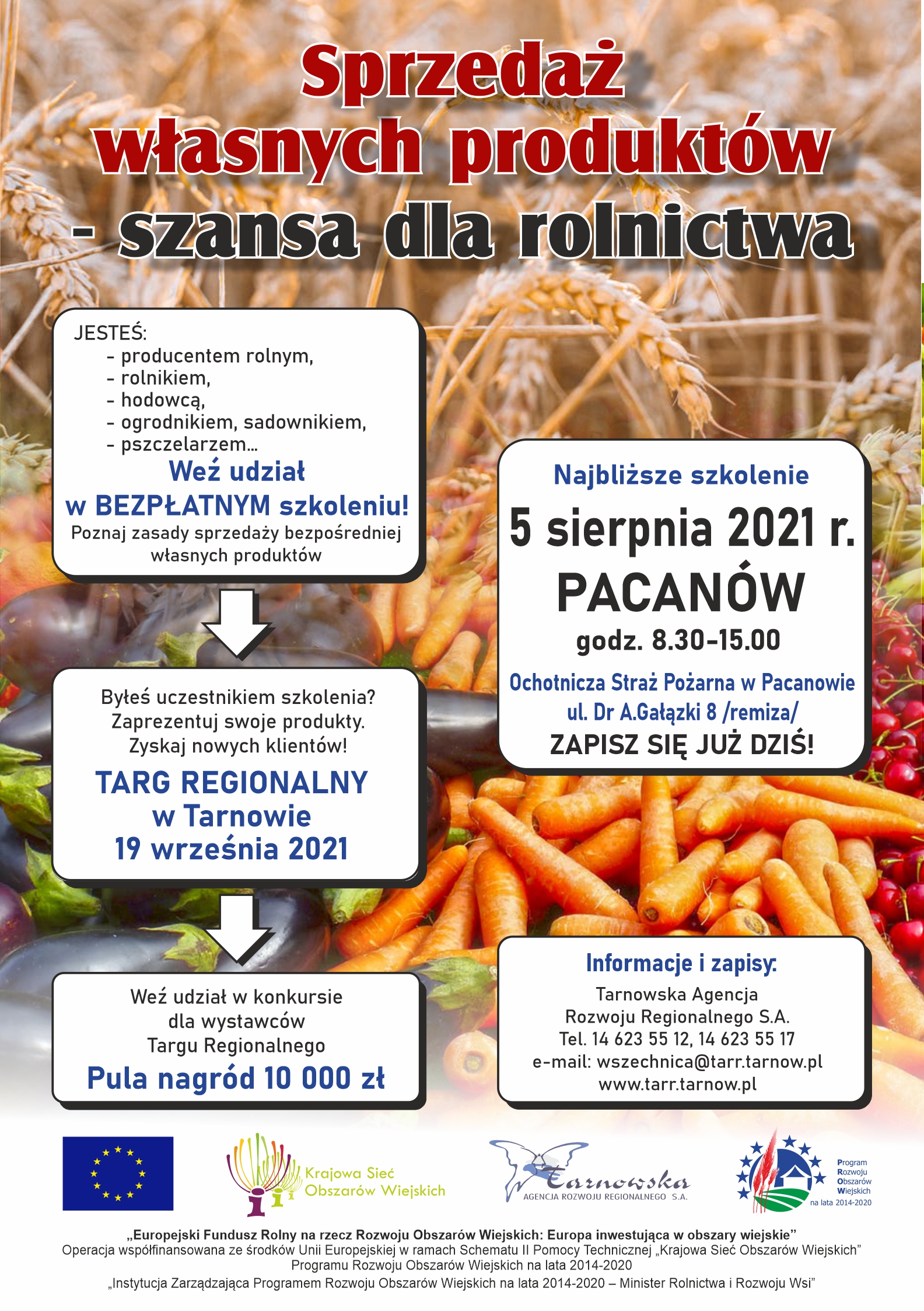 Zarząd Tarnowskiej Agencji Rozwoju Regionalnego S.A. zaprasza producentów rolnych, rolników, hodowców, ogrodników oraz sadowników do uczestnictwa w bezpłatnym szkoleniu o tematyce: „Sprzedaż bezpośrednia władnych produktów.”