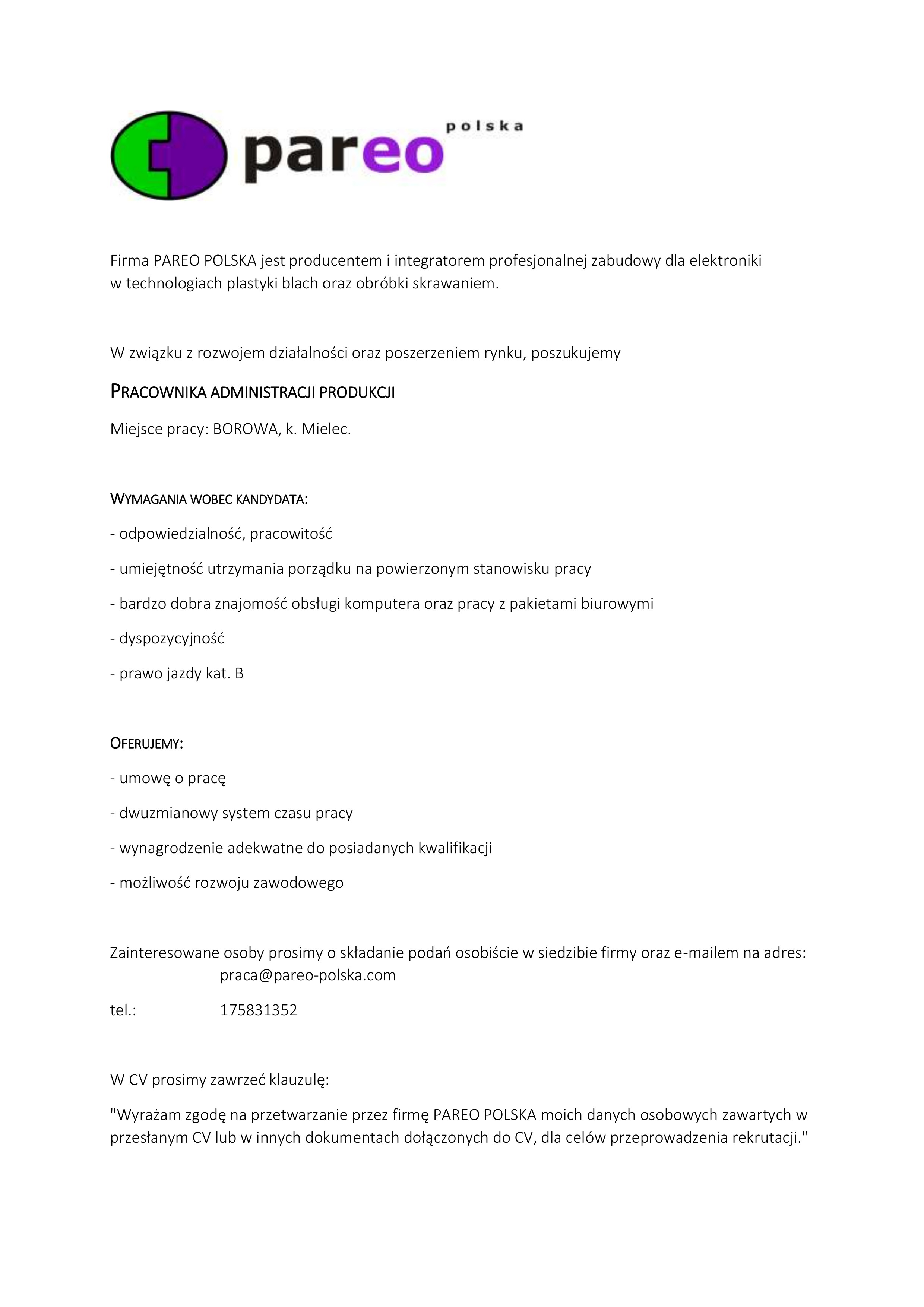Oferta pracy na stanowisko pracownik administarcji produkcji