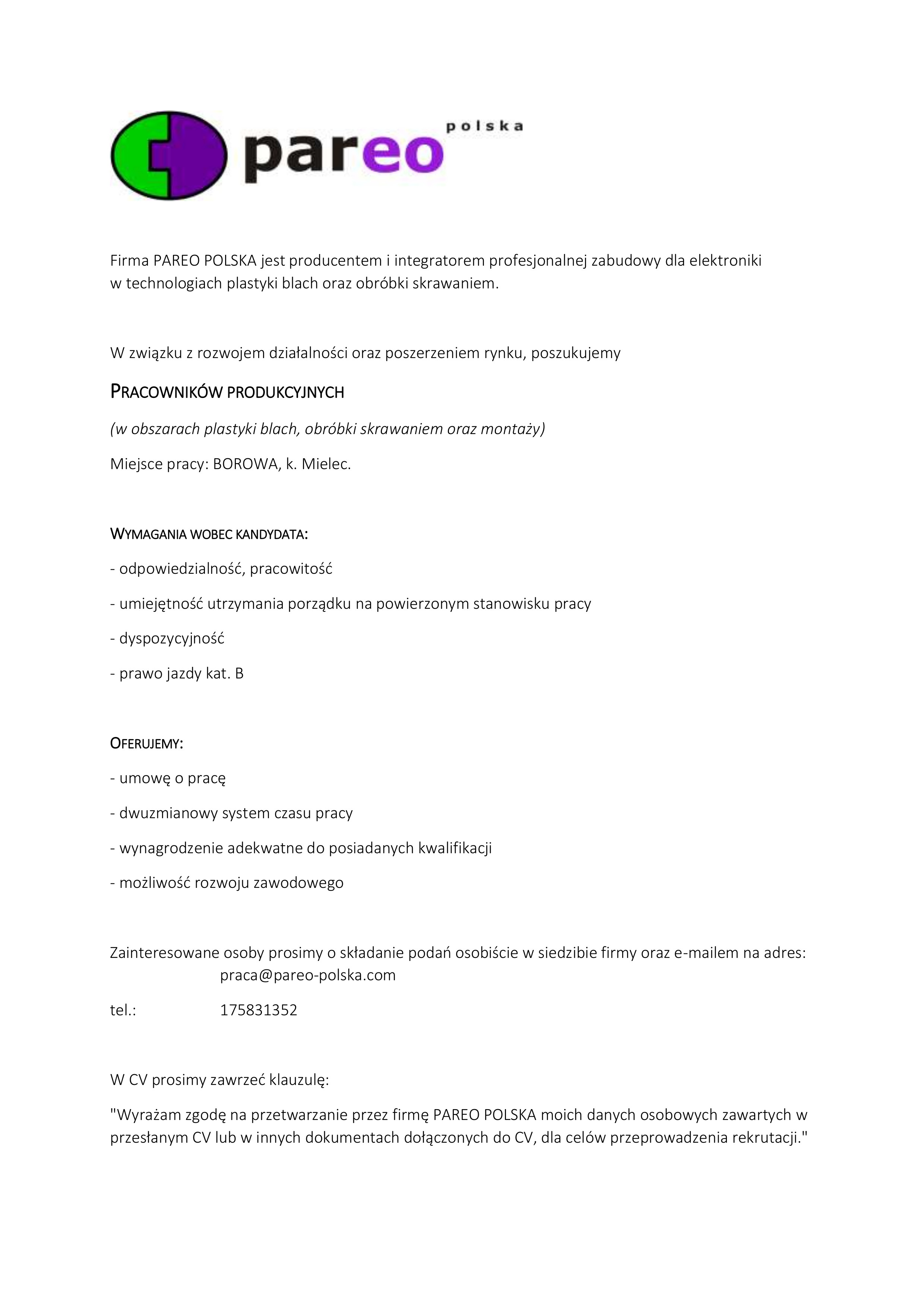 Oferta pracy dla na stanowisko pracownik produkcyjny