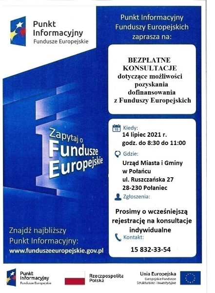 Informacja o indywidualnych konsultacjach na temat funduszy europejskich, które będą realizowane w gminie Połaniec w dn. 14.07.2021 r. w godz. 8:30 - 11.00, przez Lokalny Punkt Informacyjny Funduszy Europejskich w Sandomierzu.