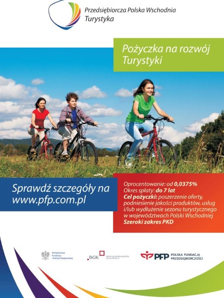 Pożyczka na rozwój turystyki umożliwia mikro-, małym i średnim firmom prowadzącym działalność turystyczną lub okołoturystyczną na terenie Polski Wschodniej (województwo świętokrzyskie, podkarpackie, lubelskie, warmińsko-mazurskie, podlaskie) sfinansowanie rozwojowych przedsięwziąć oraz wydatków związanych z prowadzeniem działalności gospodarczej. Jako przedsiębiorca, może wnioskować o nisko oprocentowaną pożyczkę o wartości do 500 tys. zł.