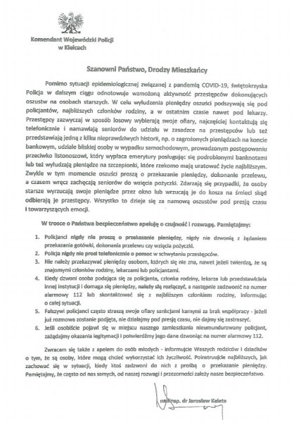 Komendant Wojewódzki Policji w Kielcach w trosce o bezpieczeństwo apeluje o zachowanie czujności i rozwagi w związku z wzmożoną aktywnością przestępców dokonujących oszustw na osobach starszych.