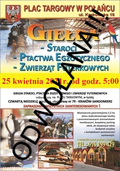 Uprzejmie informujemy, że w związku z dużym zagrożeniem wystąpienia grypy ptaków HPAI – giełda ptactwa, gołębi i zwierzątek futerkowych dn.25.04.2021r. zostaje odwołana.