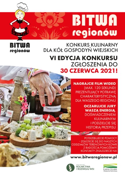 Krajowy Ośrodek Wsparcia Rolnictwa organizuje szóstą edycję konkursu kulinarnego „Bitwa Regionów".Więcej szczegółów na www.bitwaregionow.pl oraz na profilu Polska smakuje i Facebooku.