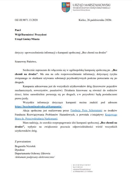 Pismo dotyczy włączenia się w ogólnopolską kampanię społeczną pn.: "Bez chemii na drodze".