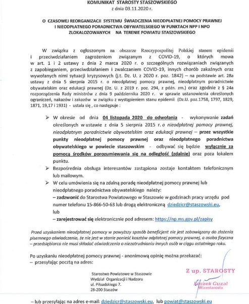 Komunikat Starosty Staszowksiego dotyczący czasowej reorganizacji systemu świadczenia niedpłatnej