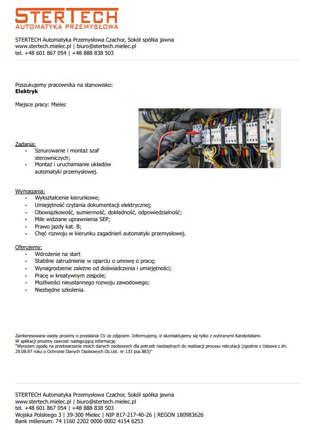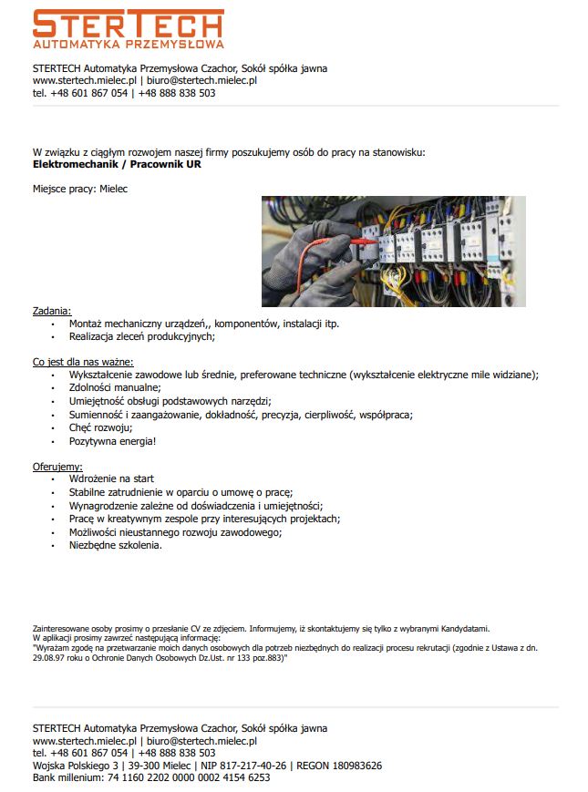 Mechatronik/Automatyk, Elektryk, Pracownik produkcjii/Monter, Elektromechanik/Pracownik UR