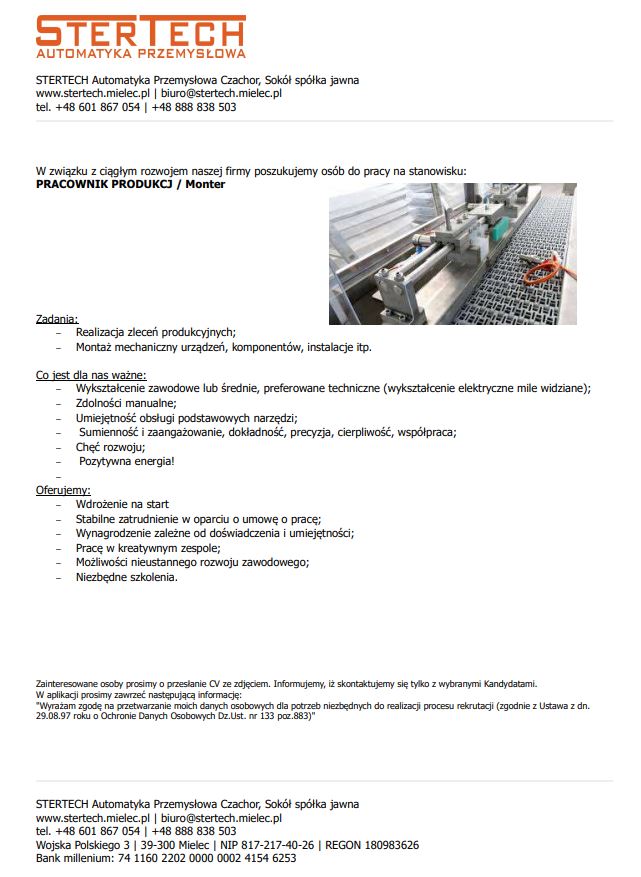 Oferta pracy dla na stanowisko pracownik produkcyjny